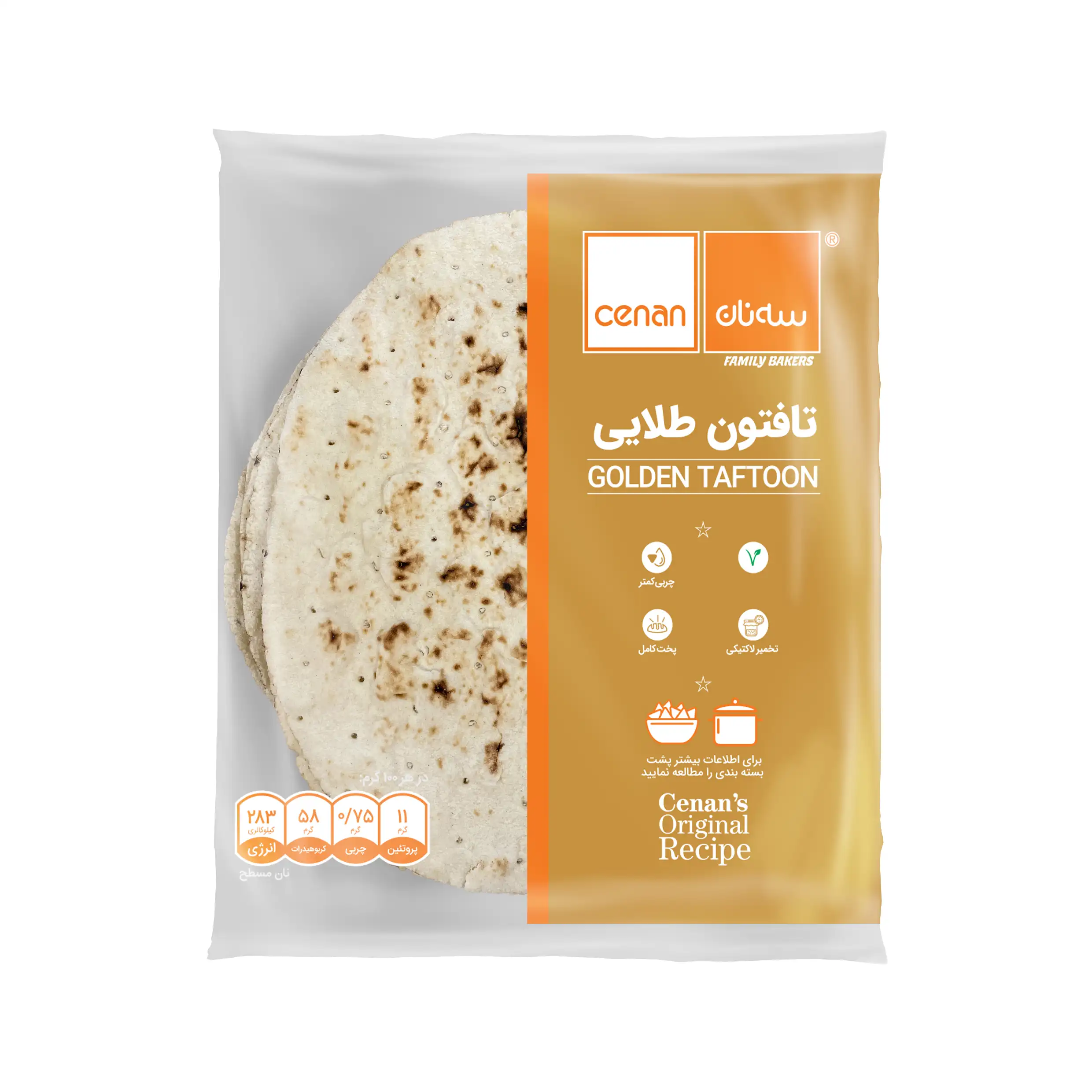نان تافتون طلایی سه نان با بافتی نازک و لطیف و طعم دلپذیر، مناسب مصرف در تمام وعده‌های غذایی است. این نان در خط تولید تمام‌اتوماتیک و پیشرفته تهیه می‌شود و خمیر آن پس از تخمیر کامل و استاندارد، در فر تونلی با حرارت غیرمستقیم پخته می‌شود.