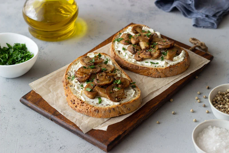 فلفل سیاه و نمک را به قارچها اضافه کنید. شعله را خاموش کنید، خامه را با قارچها ترکیب کرده و پیازچه خرد شده را در تابه بریزید و کمی هم بزنید. سپس مواد را روی نان تست جو بریزید.